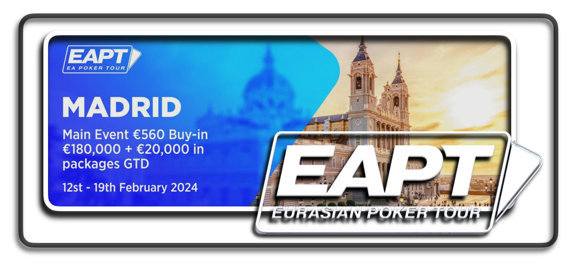 Eurasian Poker Tour, gjerne forkortet til EAPT samler pokerentusiaster fra hele kontinentet til hjertet av Spania, Madrid, for en uforglemmelig konkurranse fra 12. til 19. februar 2024. Madrid, med sin rike kulturelle arv og livlige atmosfære, er ikke bare en spektakulær vert for EAPT, men også en by som byr på en ekstraordinær opplevelse utover pokerbordene. Spillere får sjansen til å dykke ned i en verden av historiske skatter, kulinariske nytelser, og dynamisk byliv, noe som gjør deres deltagelse i EAPT til en omfattende reiseopplevelse.